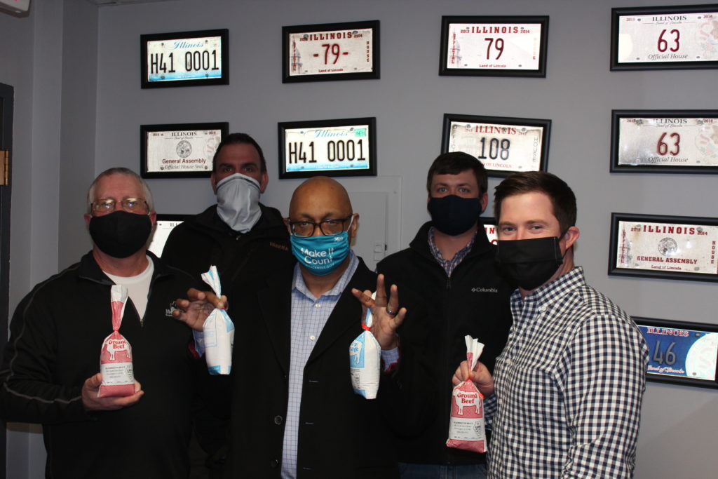 McLean County farmers (from left) Brian Dirks, Brian Banger, Patrick Killian and David Schuler delivered a meat donation to a food pantry located in the district of our Adopted Legislator, Rep. Thaddeu Jones (center).