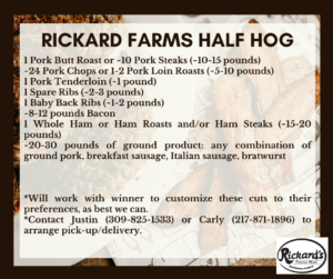 Plus you can also purchase chances for our 50/50 cash and/or a half hog raffle for 60-75lbs of pork donated by Rickard Premium Meats.
