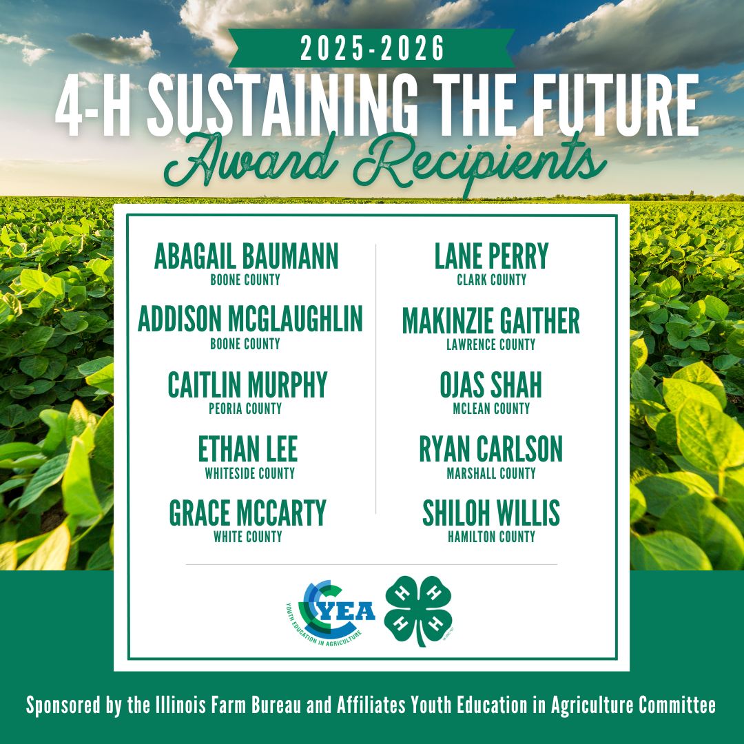 As Sustaining the Future Award recipients, these dedicated and hard-working 4-H members are invited to attend the Premier 20 Leadership Conference, an elite youth leadership and professional development opportunity, to be held April 27-28, 2026, at the Illinois Farm Bureau headquarters in Bloomington.